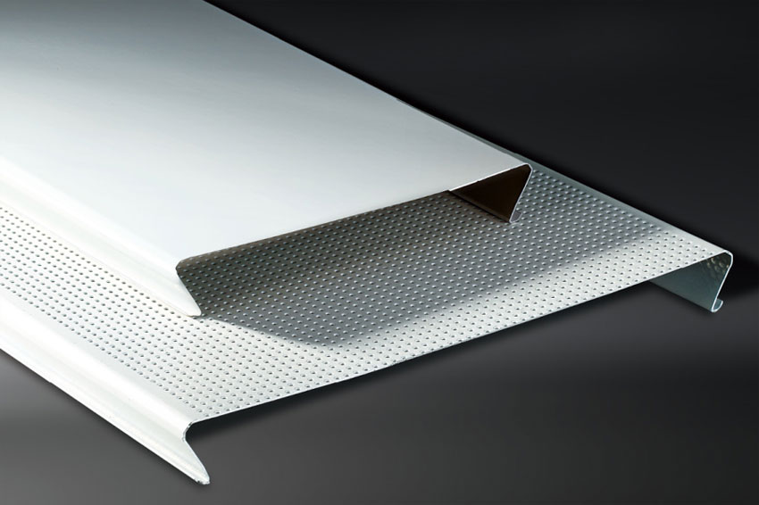 每塊板兩端可折邊,板與板兩端連接不需要任何裝飾便能很好地密拼在一起,同時可嵌入暗骨式條形方板做裝飾,解決了傳統條扣兩端不能折邊、連接收口裝飾難的問題。